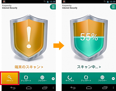 4.インストールが完了しました。念のため初期スキャンを行います。「スキャン」をタップしてください。