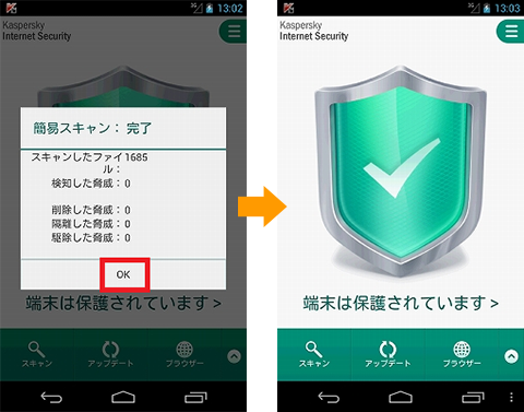 5.スキャンが完了しましたら、「OK」をタップします。グリーンの表示は端末が保護されていることを示します。
