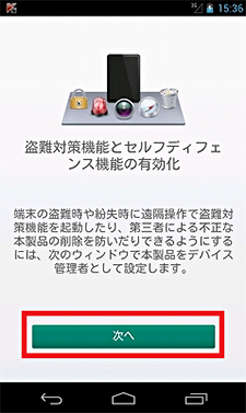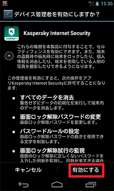 5.カスペルスキー インターネット セキュリティ for Androidに管理者権限を付与するため「有効にする」をタップします。