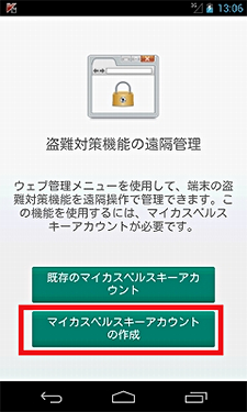 - Android製品向けの盗難対策・プライバシー保護機能をご利用になるには、メールアドレスの登録およびマイカスペルスキーアカウントの作成が必要となります。
