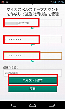 7.スマートフォン・タブレットを紛失した場合でも、確実にメールを受け取れるメールアドレス(パソコンのメールアドレスなど)とパスワードを入力し「アカウント作成」をタップします。