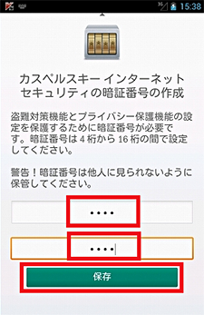 9.つづいて、管理者権限用の暗証番号を設定します。この暗証番号は端末ロックの解除に使用しますので決して忘れない番号を設定してください。