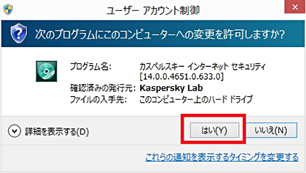 1.Windowsのユーザーアカウント制御が有効な場合(Windows XPでは表示されません)、コンピューターへの変更を確認するウインドウが表示される場合があります。インストールを続行するには「はい」を選択します。