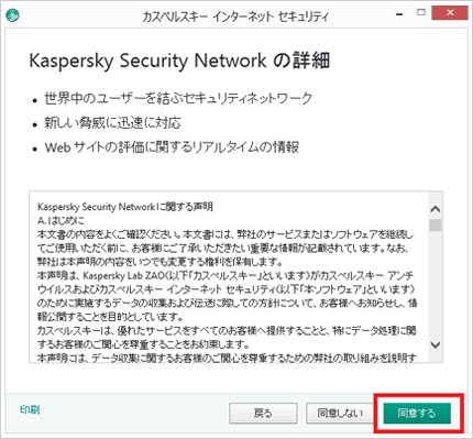 3.「Kaspersky Security Network」(※)の機能説明をお読みいただいたうえで「同意する」をクリックください。