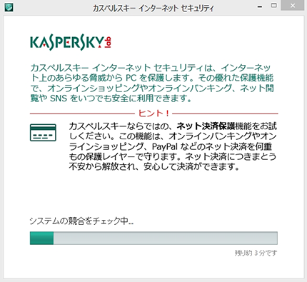 - カスペルスキー セキュリティは、他のセキュリティソフトと同時にインストールして使用することができません。他のセキュリティソフトが存在する場合、インストール中に該当のセキュリティソフトのアンインストールをお願いする場合がございます。