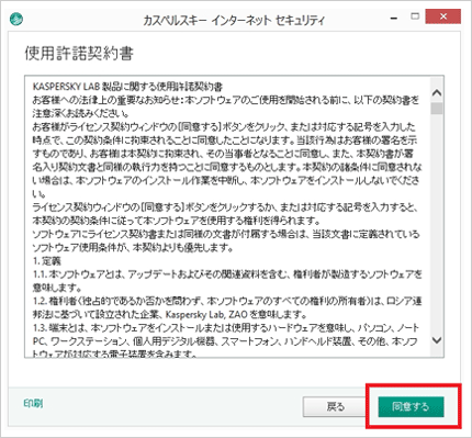 3.「Kaspersky Security Network」 の機能をご利用いただく際にご了承いただきたい点がございます。お読みいただいたうえで「同意する」をクリックください。「同意しない」をクリックした場合でも、プログラムはインストールされます。