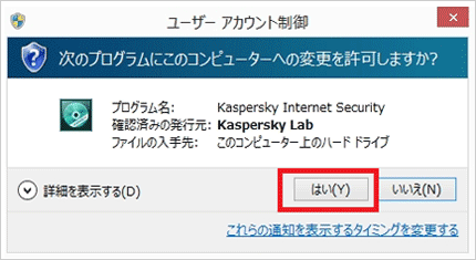 4.Windowsのユーザーアカウント制御が有効な場合(Windows XPでは表示されません)、コンピューターへの変更を確認するウインドウが表示される場合があります。プログラムのインストールを続行するには「はい」を選択します。