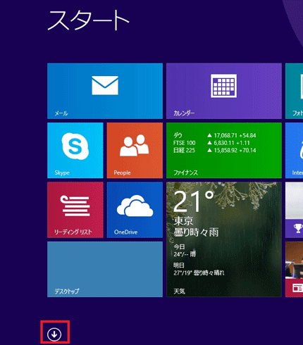 (1)Windowsのスタート画面、下を指す矢印のマークをクリックしてアプリのメニューを呼び出します。