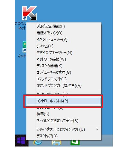(2)Windowsアイコンを右クリックして、メニューを表示させ「コントロールパネル(P)」を選択します。
