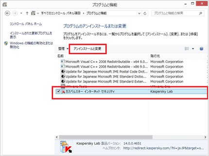 2.アンインストール手順「カスペルスキー インターネット セキュリティ」にチェックボックスを入れて、「アンインストールと変更」をクリックします。